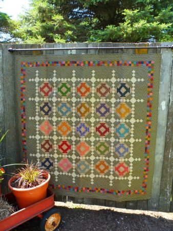 Scrappy lap quilt built around the popular and traditional Churn Dash block. This quilt pattern allows the quilter to use a large variety their favorite color prints. You can use up to 25 different fabrics!